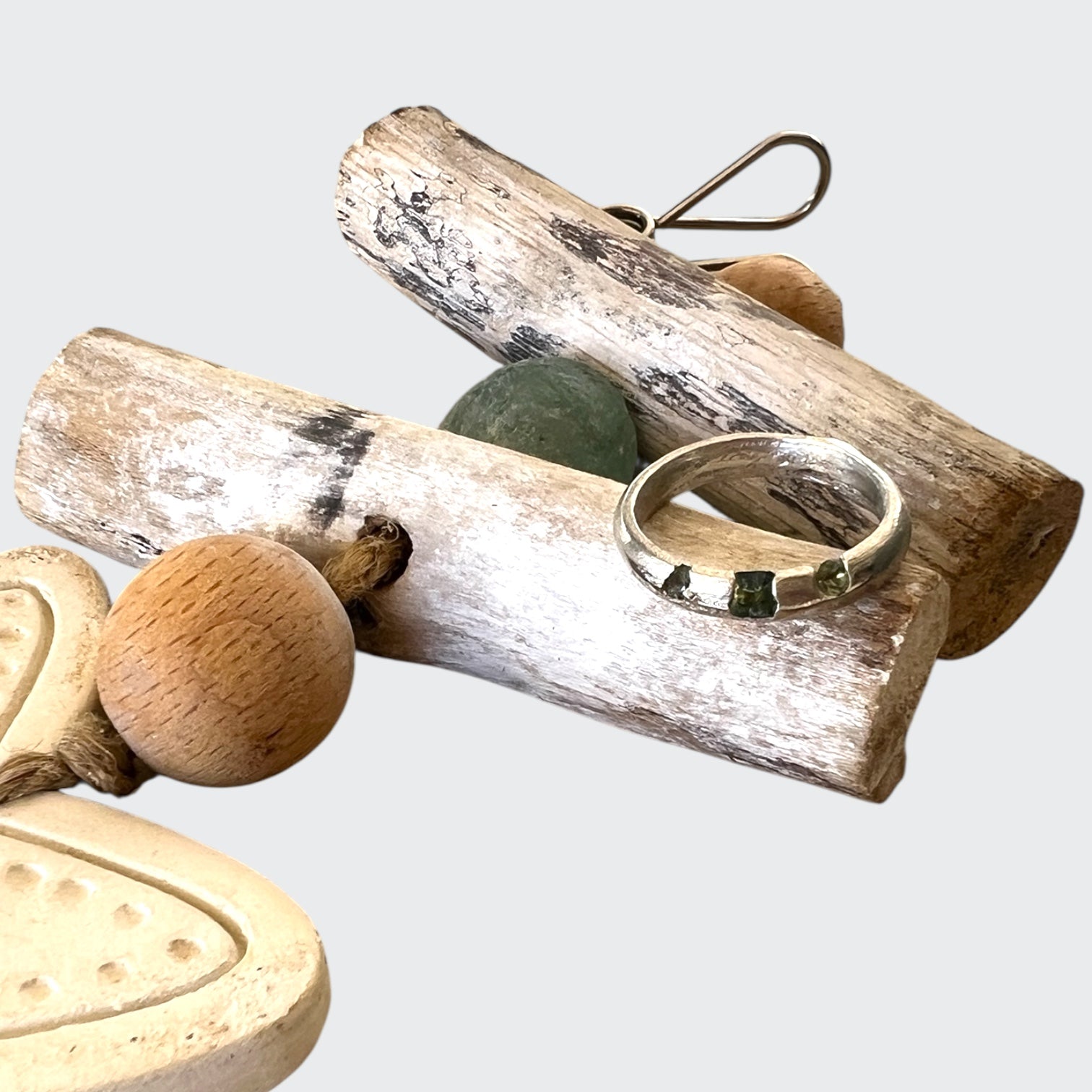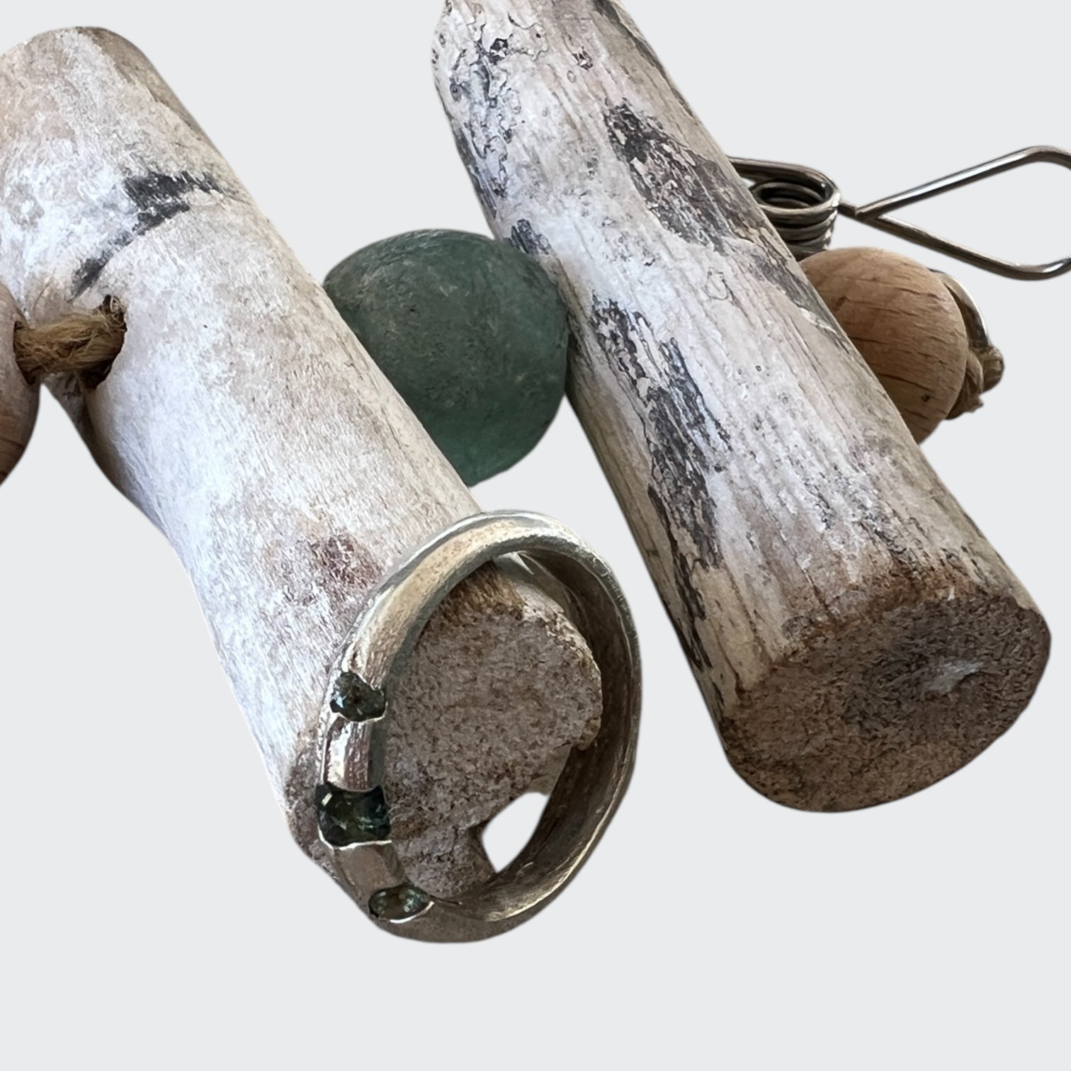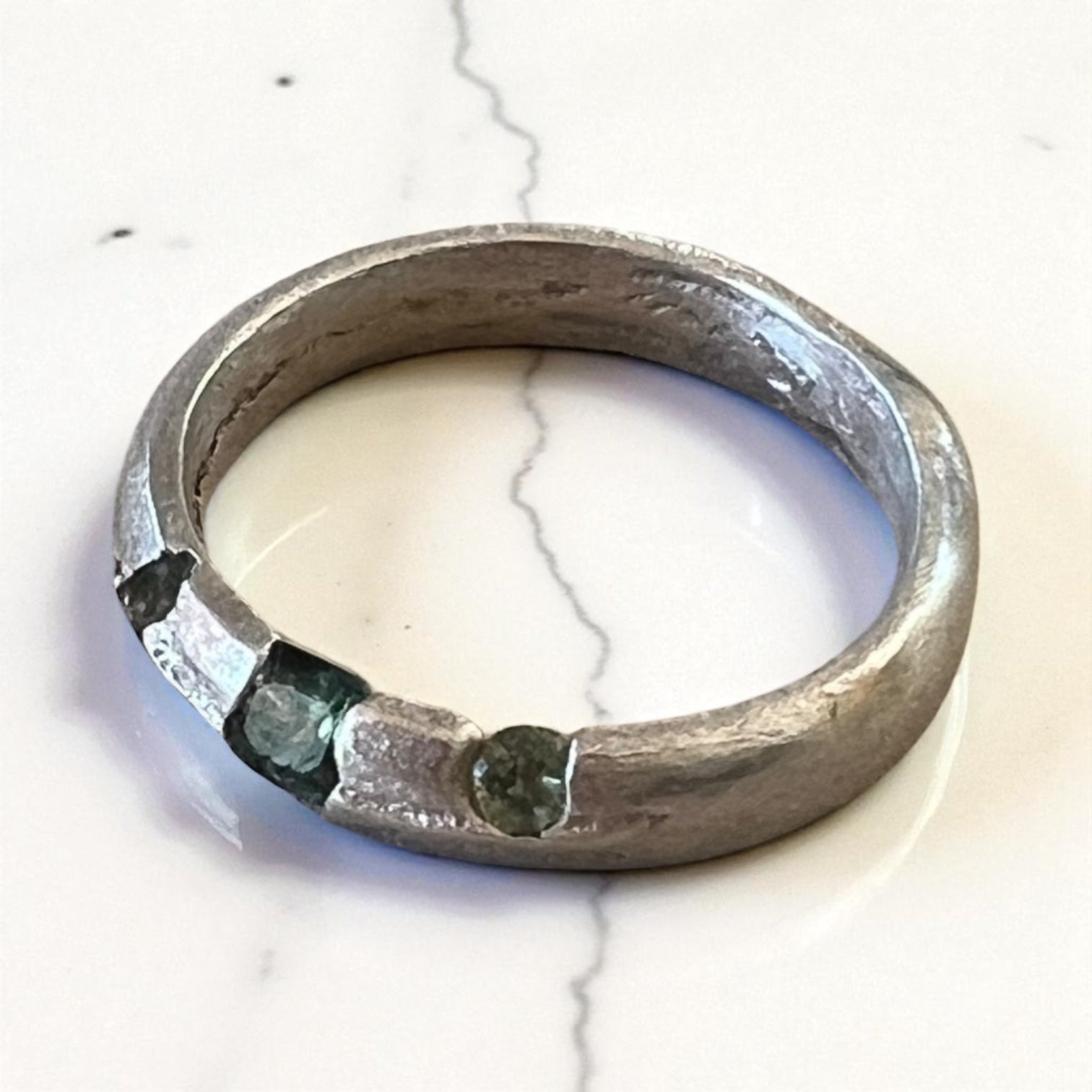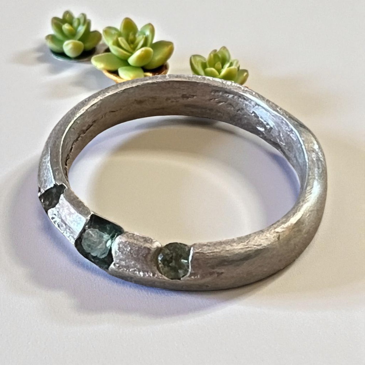 Chunky sapphire ring in sterling silver, unique light green cut sapphires