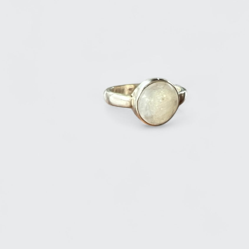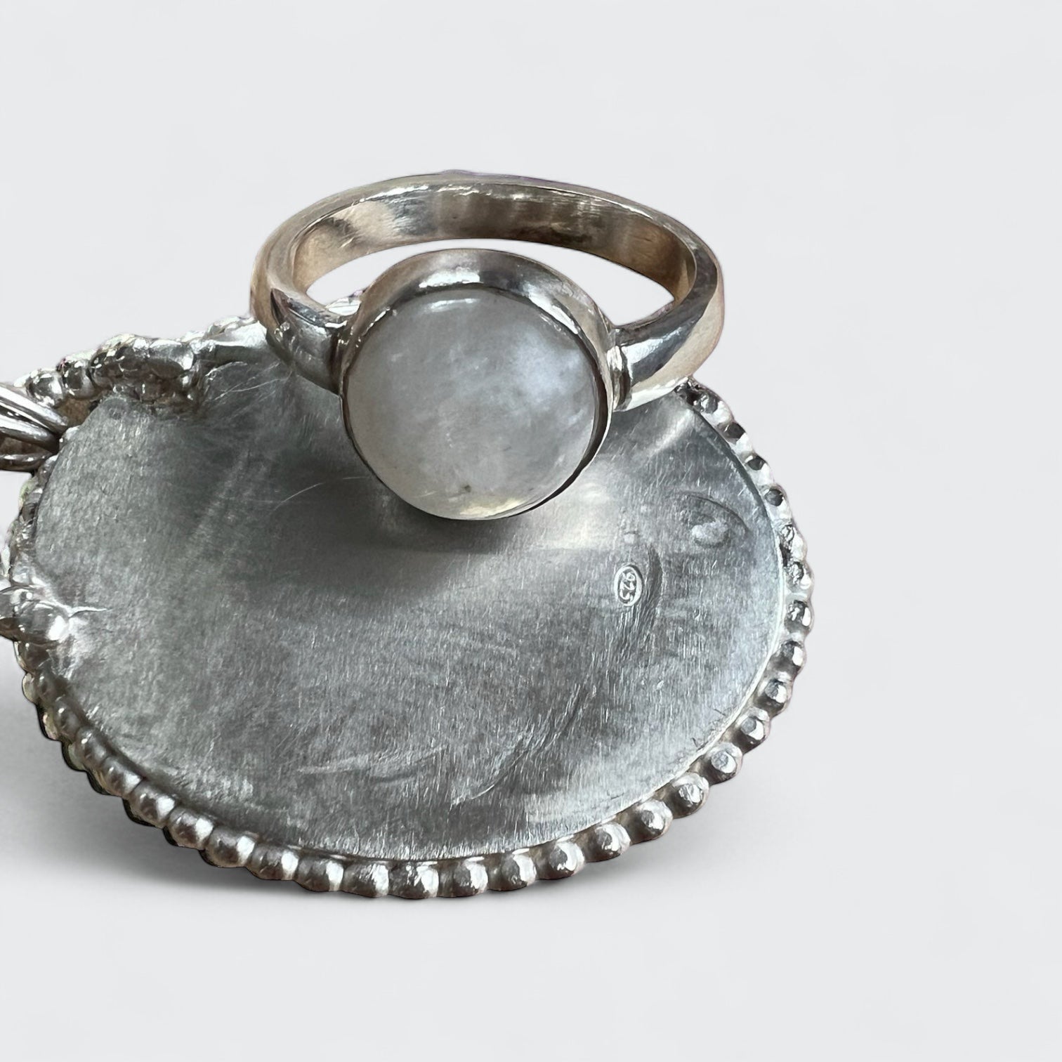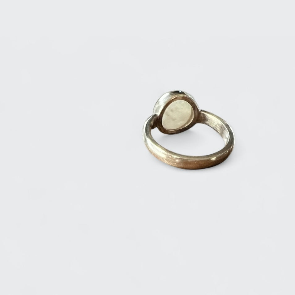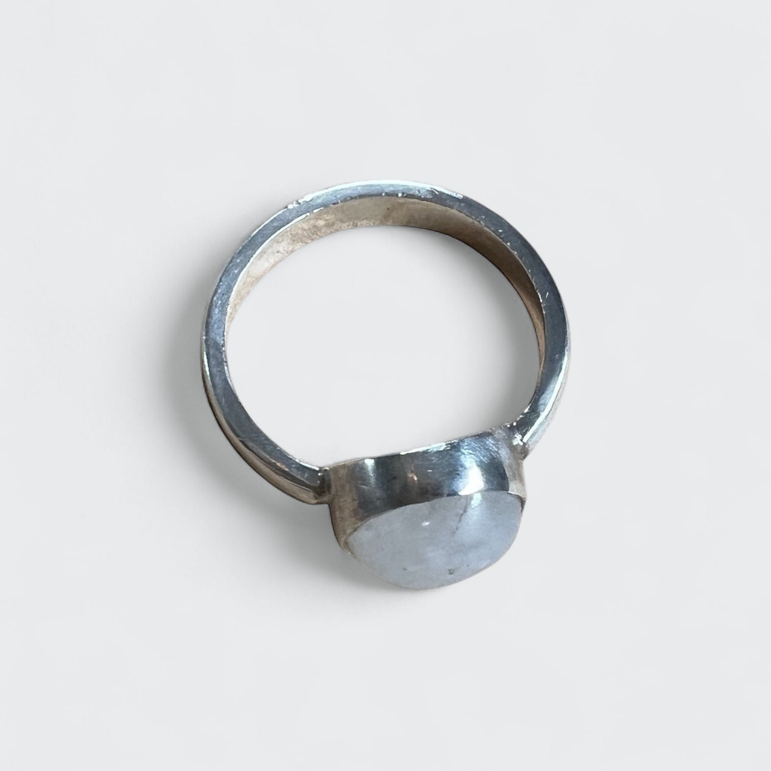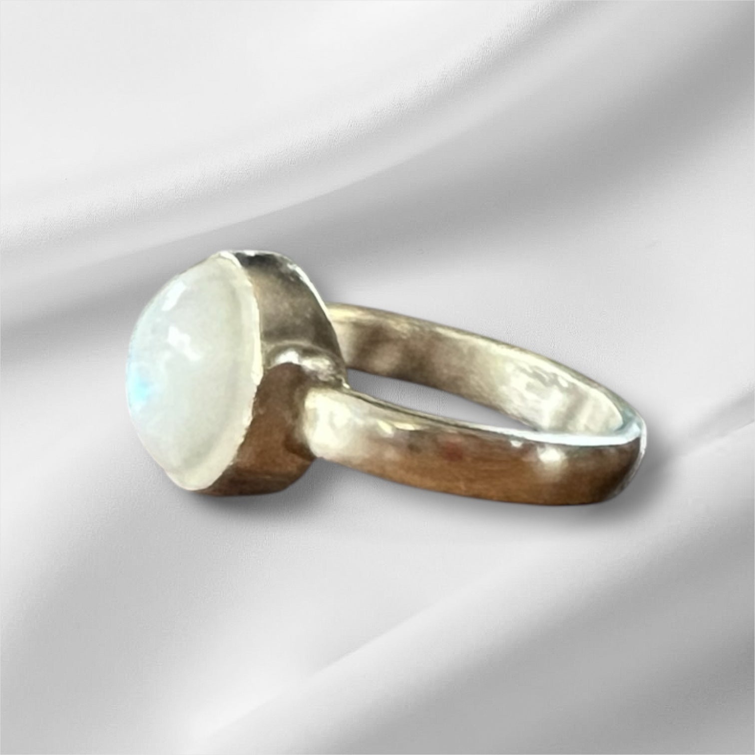 A dreamy white stone with blue flashes of colour. (Iridescent, White, Blue)