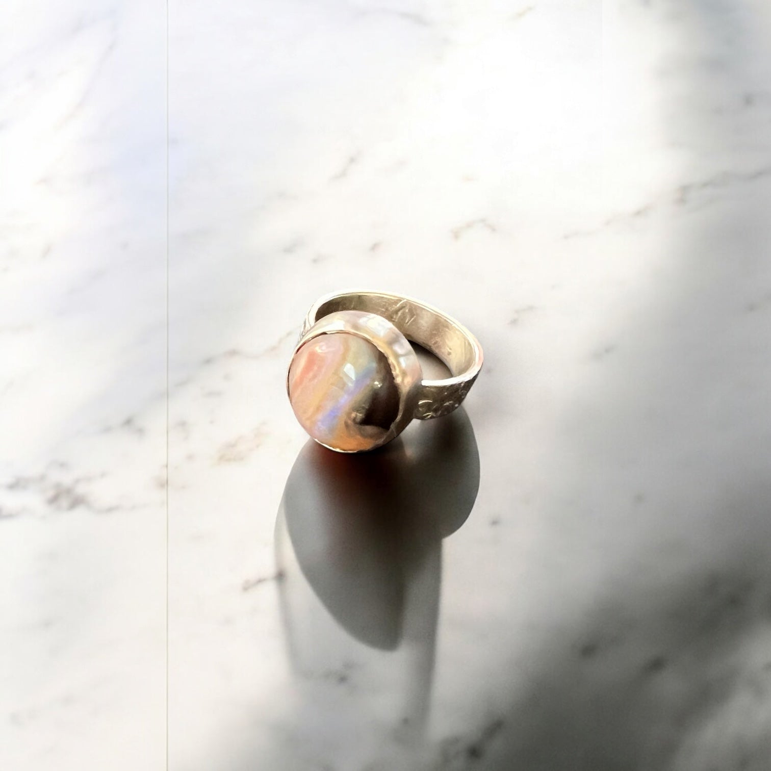 Grey/Black Potch Opal with silica spheres of Agate/Blue/Amber. In certain light sparkles of amazing green flashes.